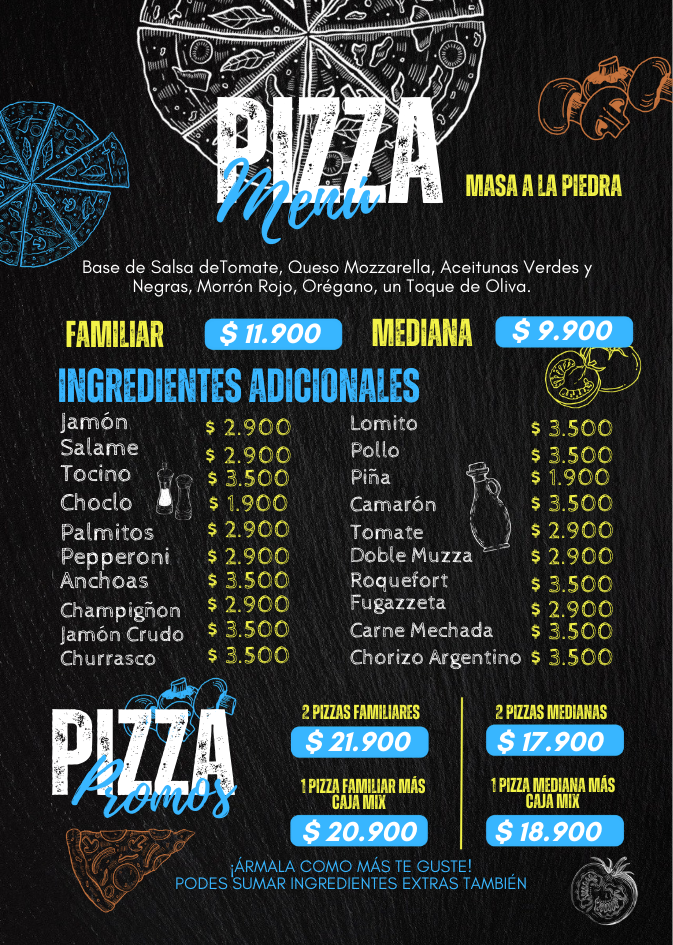 Bienvenido a LA MUZZA PIZZERIA, un lugar con la auténtica tradición de Argentina que sirve pizzas desde 1965. Nuestras pizzas se preparan con Masa a la Piedra, e incluyen una base de Salsa de Tomate, Queso Mozzarella, Aceitunas Verdes y Negras, Morrón Rojo, Orégano y un Toque de Oliva . ¡Disfruta de la calidad con sabor a tradición!